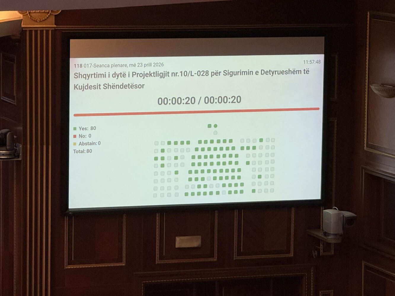 “Më 80 vota për, asnjë kundër dhe asnjë abstenim konstatoj se Kuvendi miratoi Projektligjin nr.10/L-028 për Sigurimin e Detyrueshëm të Kujdesit Shëndetësor. Faleminderit”, ka thënë kryetarja e Kuvendit Albulena Haxhiu.
