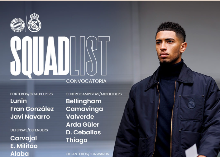 Real Madridi sapo ka publikuar listën e lojtarëve të ftuar për ndeshjen e nesërme ndaj Bayern Munchen.