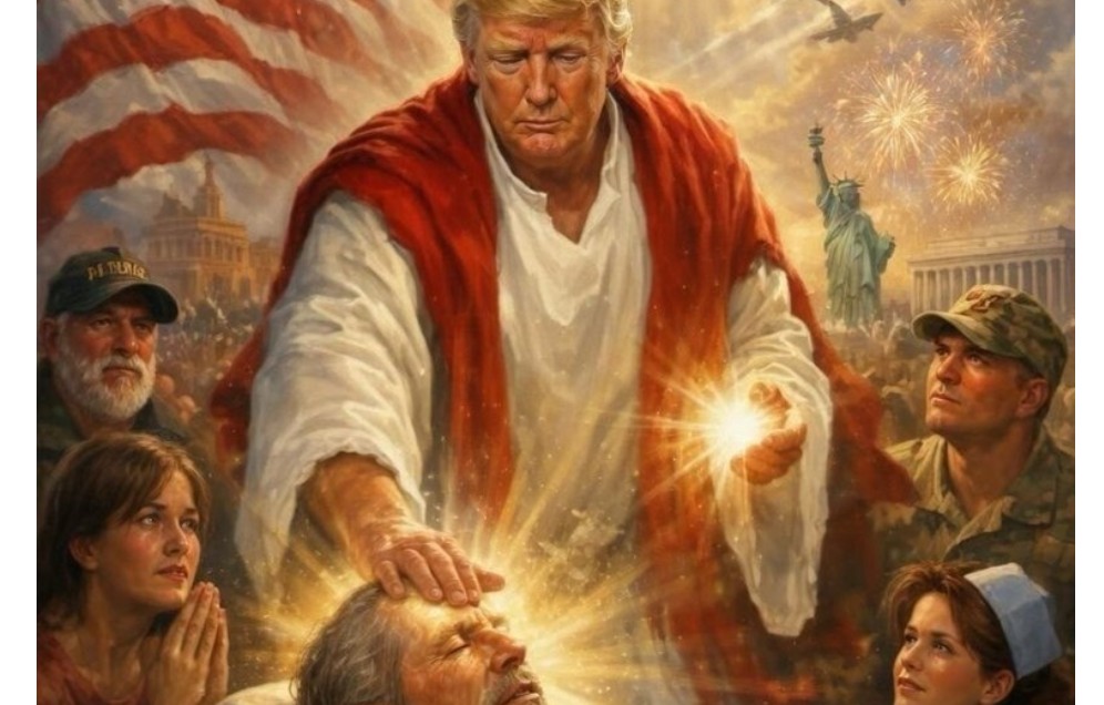 Imazhi i parë tregon Trumpin si një figurë fetare duke vënë duart mbi një person të sëmurë dhe duke e “shëruar” atë me dritë. Ai është i rrethuar nga ushtarë, personel mjekësor dhe civilë, ndërsa në sfond janë të dukshëm flamuri amerikan, avionët luftarakë dhe shqiponjat, dhe figura të ngjashme me luftëtarë qëndrojnë pezull mbi të.