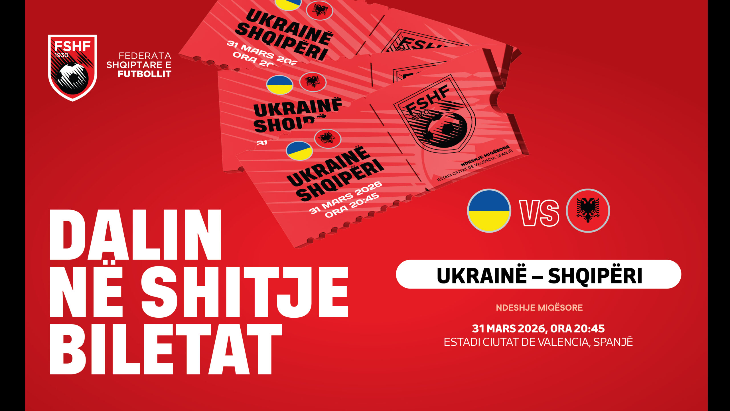 Federata Shqiptare e Futbollit (FSHF) njofton se biletat për ndeshjen miqësore mes Ukrainës dhe Shqipërisë tashmë janë lëshuar në shitje. Takimi do të zhvillohet më 31 mars, në orën 20:45, në stadiumin “Estadi Ciutat de València” në Valencia të Spanjës.